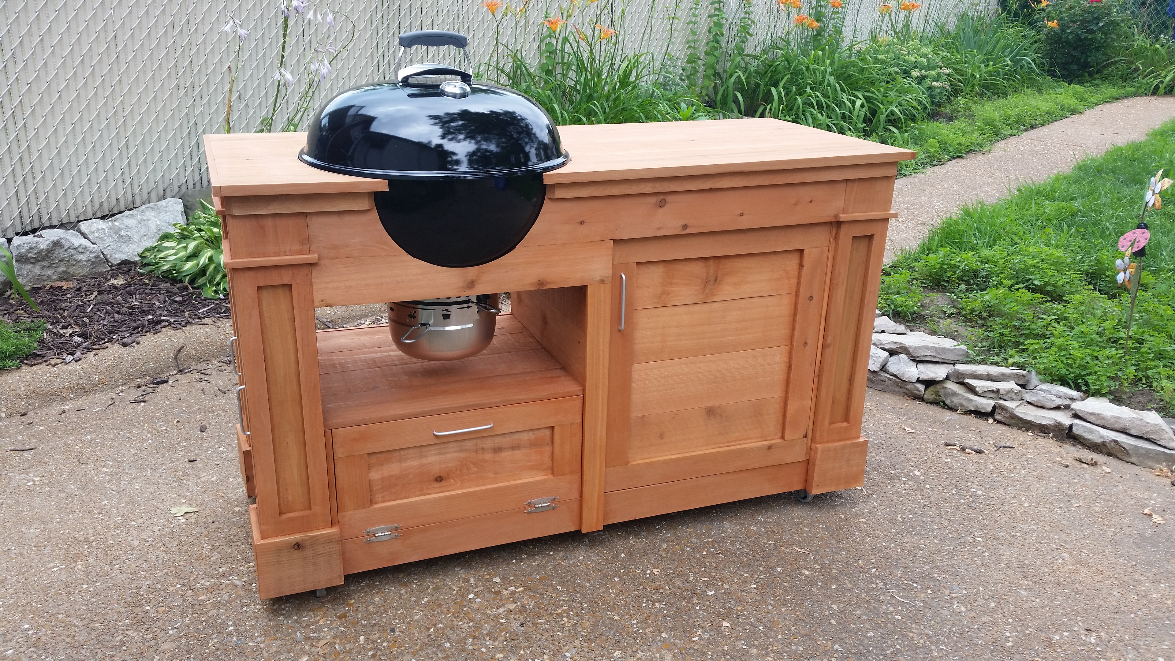 The gap between an outdoor kitchen and a standalone grill is astonishing. Out of frustration I decided to build my own grill station. The frame and skin are built out of solid cedar so it has stood strong for 5 years now. As you may already be wondering–the top has seen better days. Though it isn't from catching fire as many of the first critics were concerned but rather cupping due to moisture. I believe concrete is the way to go but would add considerable weight and at this point I think an outdoor kitchen would be easier.