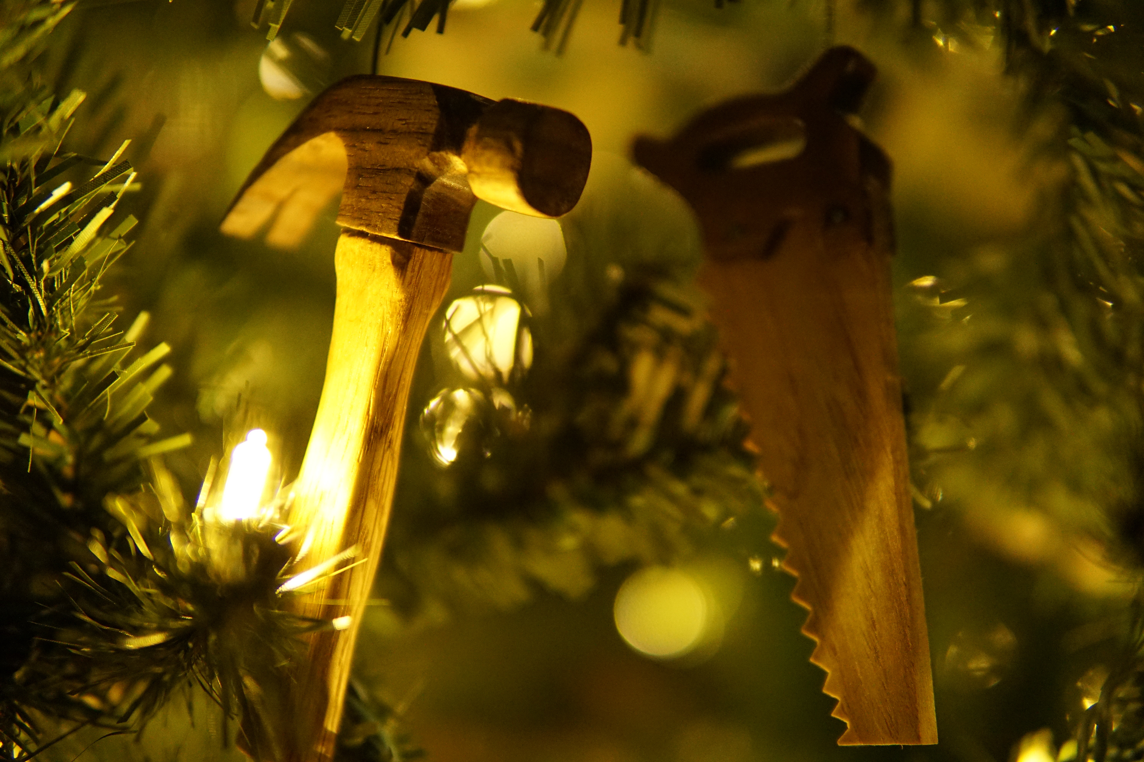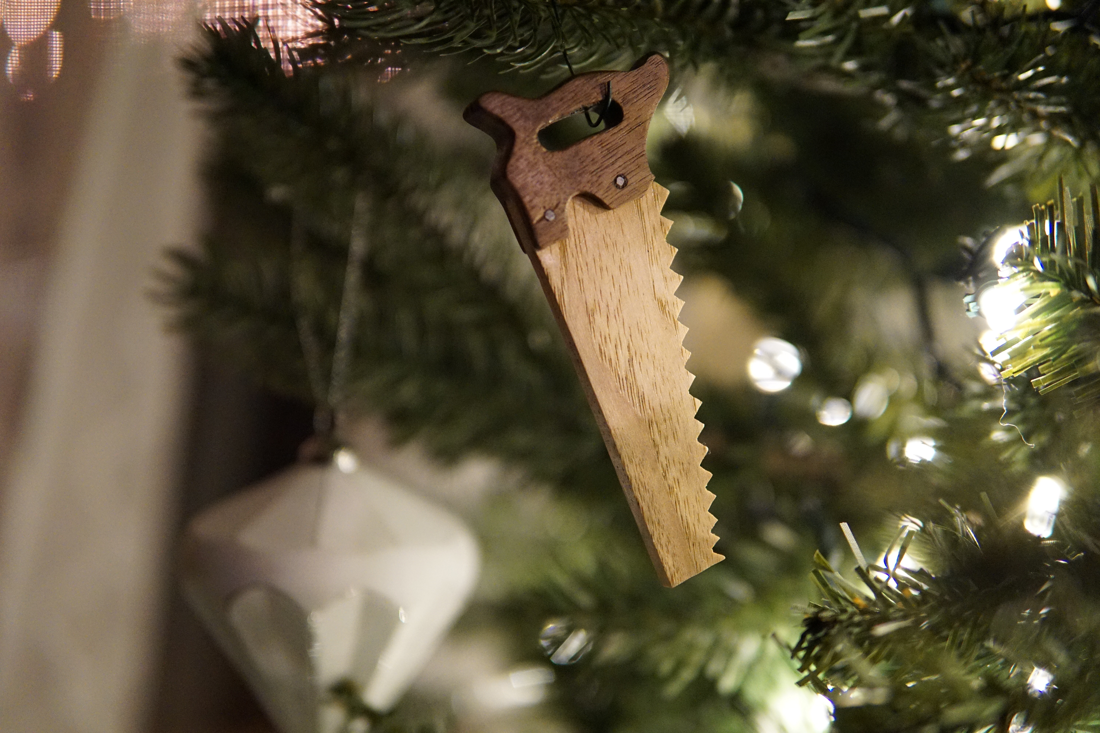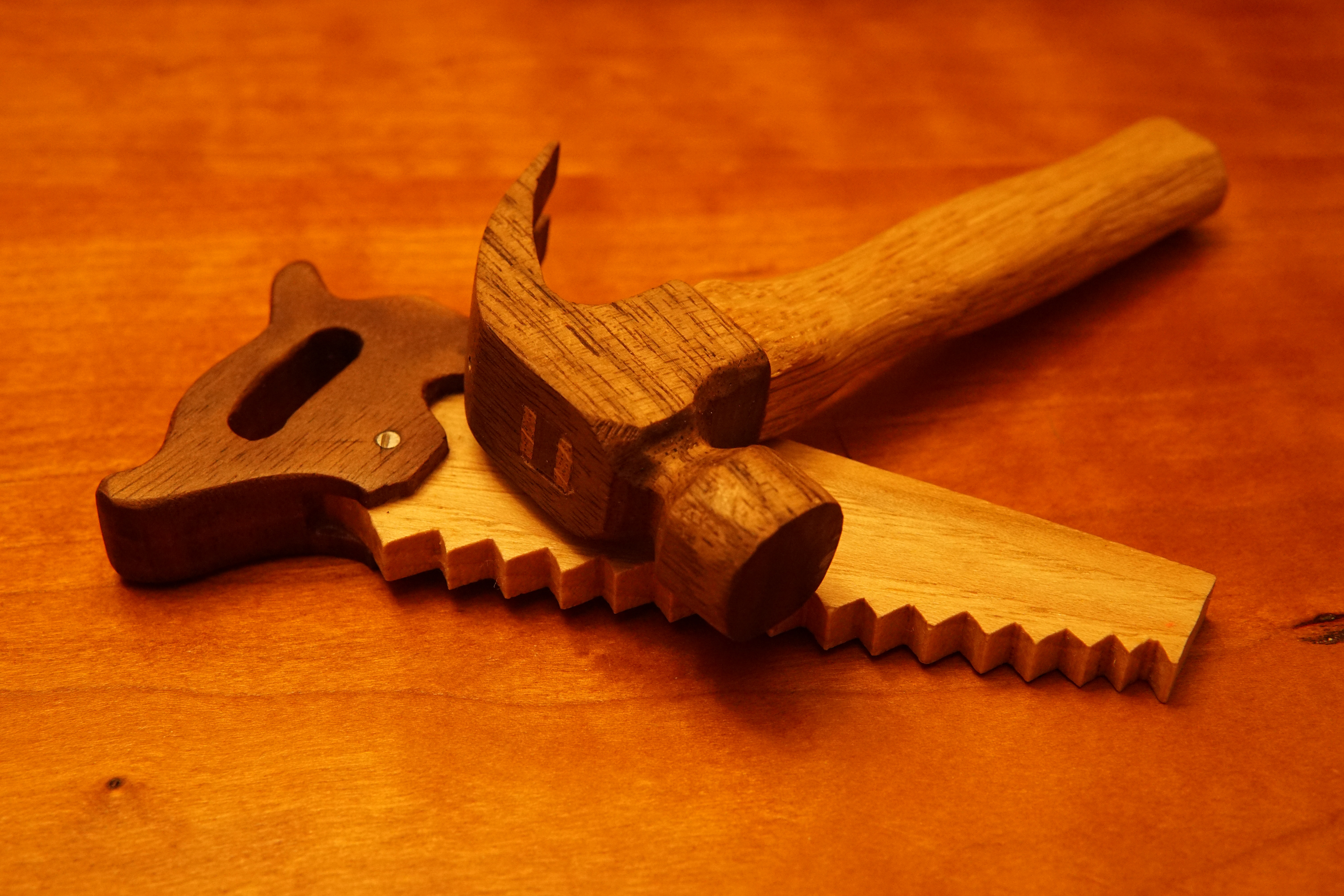 Once I had a bandsaw up and running I began finding reasons to use it. Walnut and Maple are a good contrast for small ornaments. Going into these I was concerned I would not enjoy it but once I began planning how they would be built that all changed. The hammer is built like the real thing and the saw was just a couple of cut off nails.
